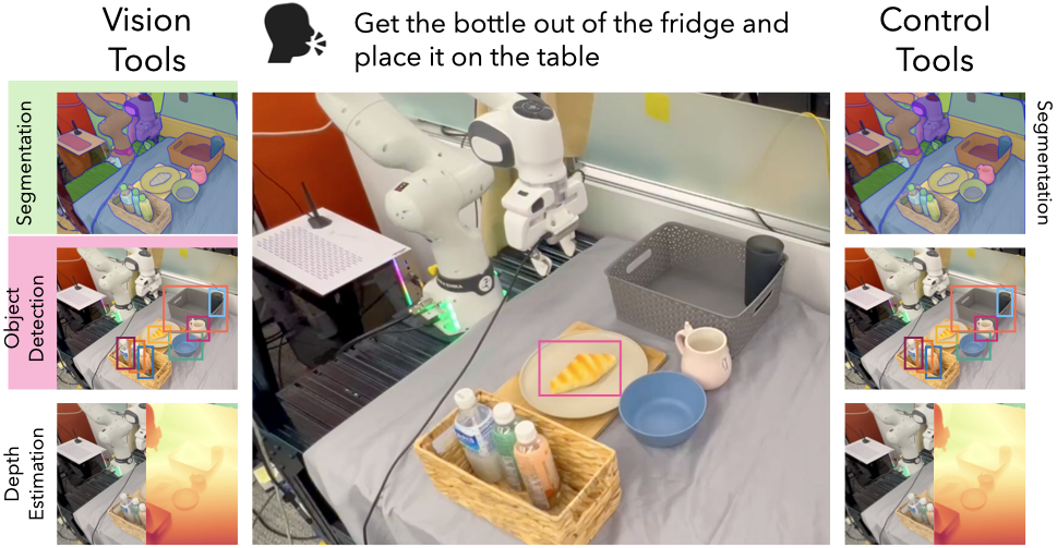 A multi-agent orchestration system for high-level planning with vision models and low-level point-based control.